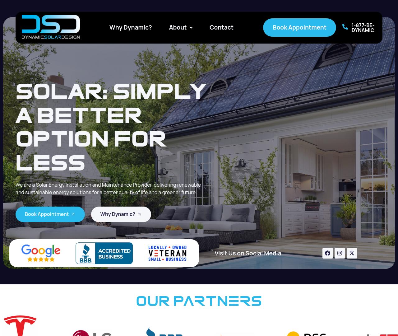 We built a conversion-focused website for Dynamic Solar Design, a solar energy company specializing in affordable, high-efficiency residential and commercial solar solutions. The responsive layout integrates SEO-optimized content, intuitive navigation, and strong call-to-actions to guide users toward scheduling a free quote. Key sections such as “Why Solar?”, “Renewable Energy Solutions,” and a detailed FAQ segment educate visitors on solar panel benefits and installation processes, while building trust through Google and BBB reviews, visual client testimonials, and a showcase of trusted partners like Tesla, LG, and Enphase.